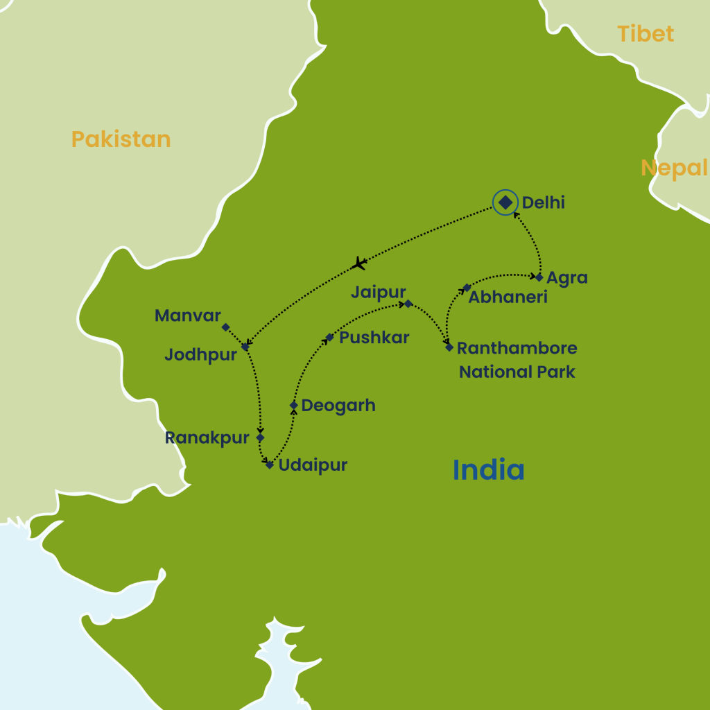 This journey explores India’s diverse cultural and historical heritage across key locations. In Delhi, witness the blend of ancient and modern with sites like Red Fort, Jama Masjid, and Humayun’s Tomb. Manvar in the Thar Desert offers desert life and camel rides. Jodhpur, the “Blue City” is known for Mehrangarh Fort and vibrant markets. Udaipur, the “City of Lakes,” charms with City Palace and serene Lake Pichola. Deogarh provides rural experiences and heritage stays. The Pushkar Festival, Rajasthan’s largest celebration, is a vibrant blend of pilgrimage, a massive cattle fair, colorful bazaars, camel races, traditional music, dance, and mouth-watering delicacies. Jaipur, the “Pink City,” showcases Amber Fort, Hawa Mahal, and local culture. Ranthambore thrills with wildlife safaris. Finally, Agra reveals Mughal grandeur at the Taj Mahal and Agra Fort.