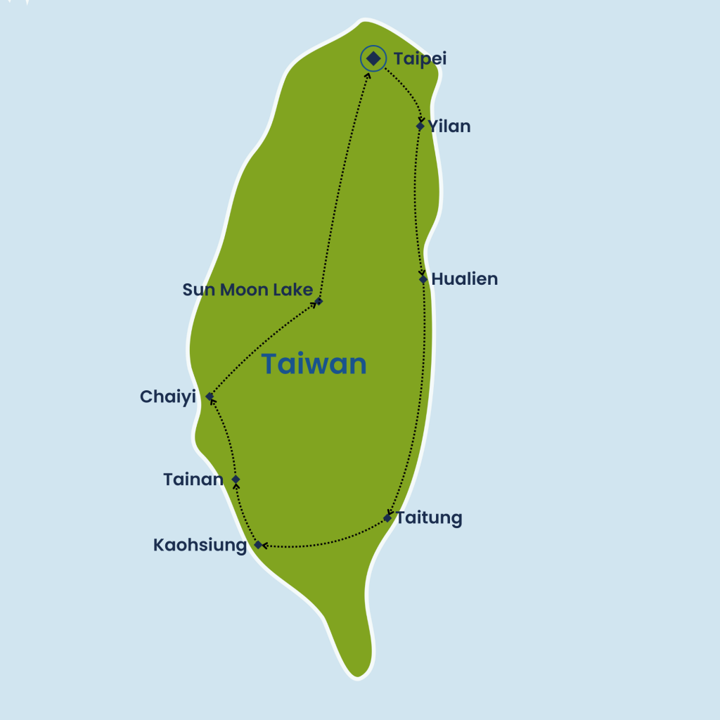 Embark on a captivating 12-day journey through Taiwan, beginning with the vibrant cityscape of Taipei, rich in history and modern culture. Explore iconic sites like the National Palace Museum and Taipei 101 before venturing to scenic natural wonders including Yehliu Geopark, Alishan’s mystical forests, and the tranquil Sun Moon Lake. Discover cultural treasures in historic cities like Tainan, and unwind in rejuvenating hot springs along the East Coast. Experience the diverse landscapes, from coastal cliffs to lush mountains, and immerse yourself in Taiwan’s rich heritage, vibrant markets, and serene temples. This thoughtfully curated itinerary offers a perfect balance of nature, culture, and urban excitement for an unforgettable Taiwanese adventure.