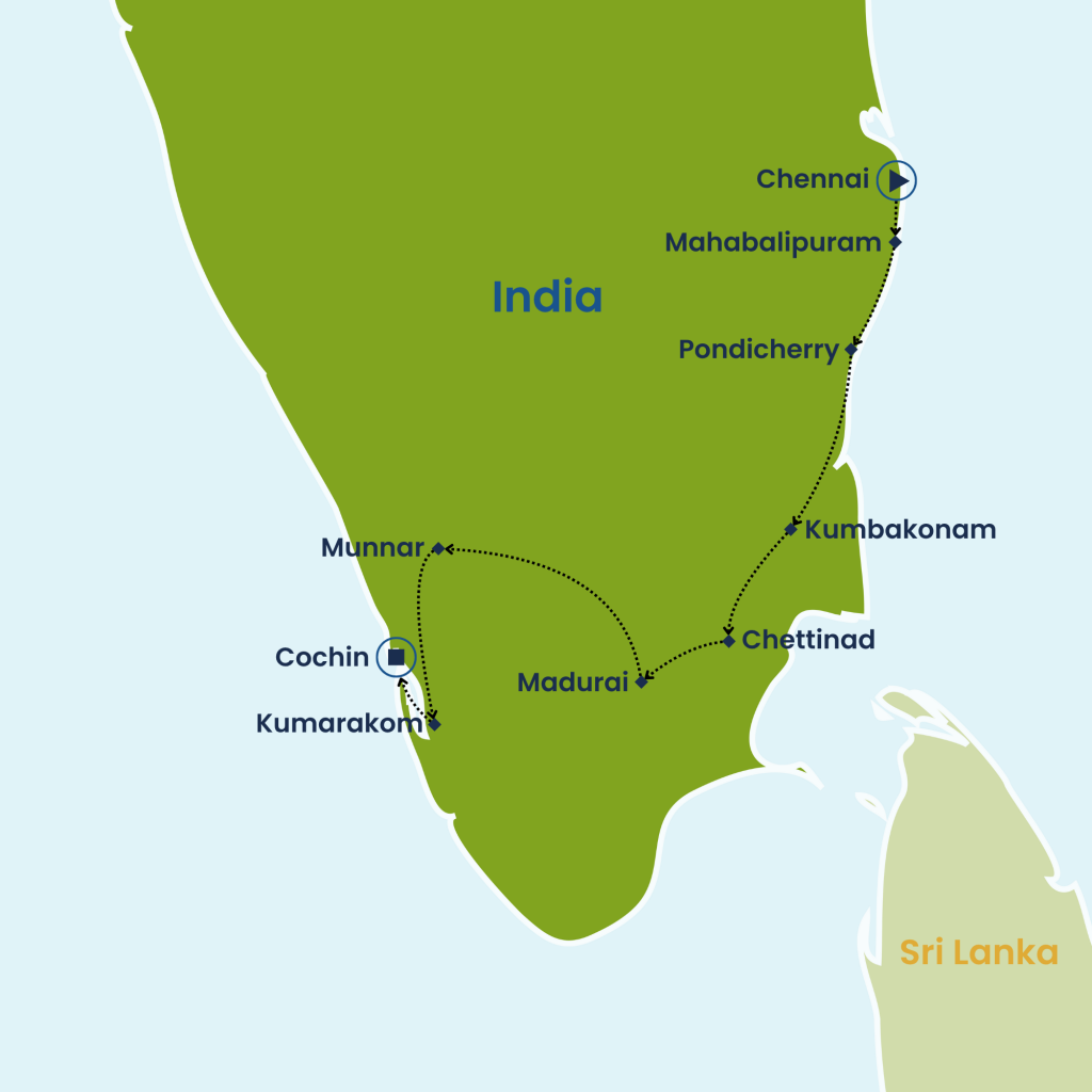 Explore South India on this 14-day journey through culture, history, and natural beauty. Begin in Chennai with vibrant markets and Dravidian temples, then visit Pondicherry’s French Quarter and Auroville. Discover Kumbakonam and Chettinad with ancient temples, traditional crafts, and village life. In Madurai, marvel at the Meenakshi Temple and Tirumalai Nayak Mahal, then ascend to Munnar’s scenic tea plantations. Relax in Kumarakom with backwater cruises and spice walks, and conclude in Cochin, exploring colonial streets, historic churches, and Chinese fishing nets at sunset. A journey of unforgettable sights, flavors, and experiences.